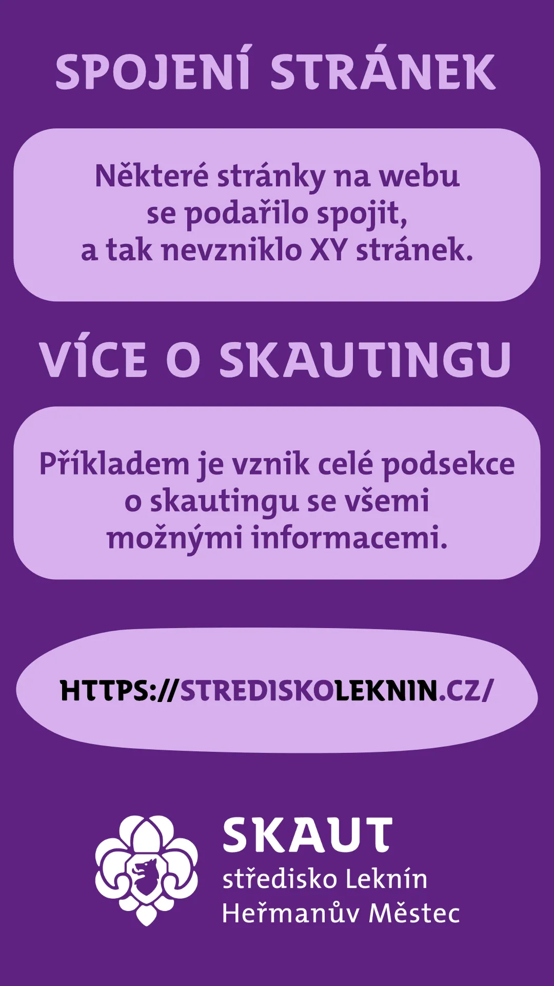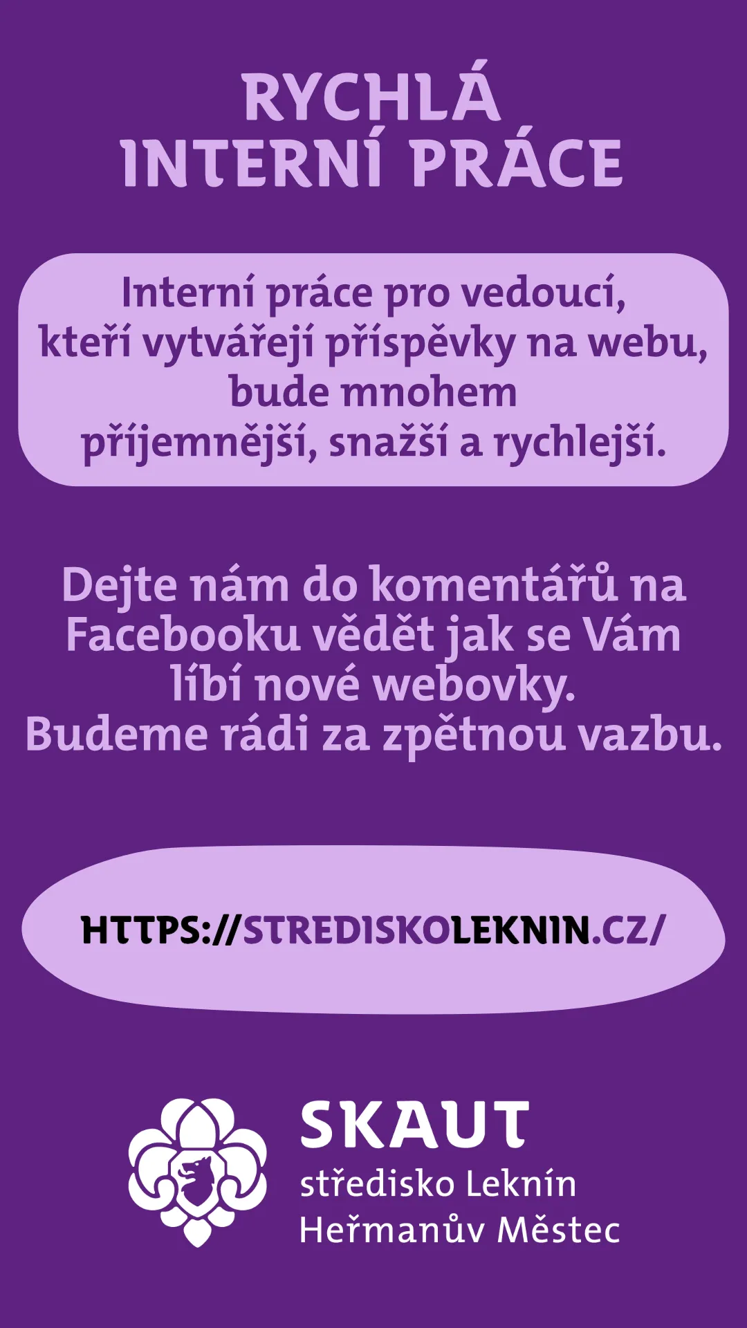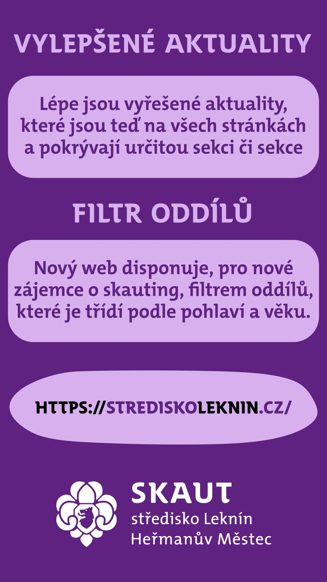 V roce 2018 započal Michal Nováček (Šroubek) svojí cestu ve výrobě nového webu, který se spustil v roce 2020. Znáte ho podle adresy https://strediskoleknin.skauting.cz/.